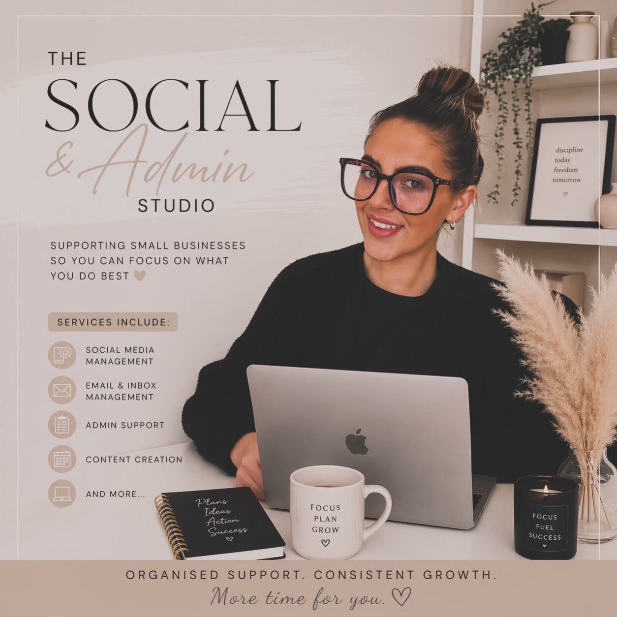 At The Social and Admin Studio, we are dedicated to providing comprehensive administrative support and expert social media management. Our goal is to free up your time, enhance your efficiency, and strengthen your brand's online presence, fostering growth and success for your business.